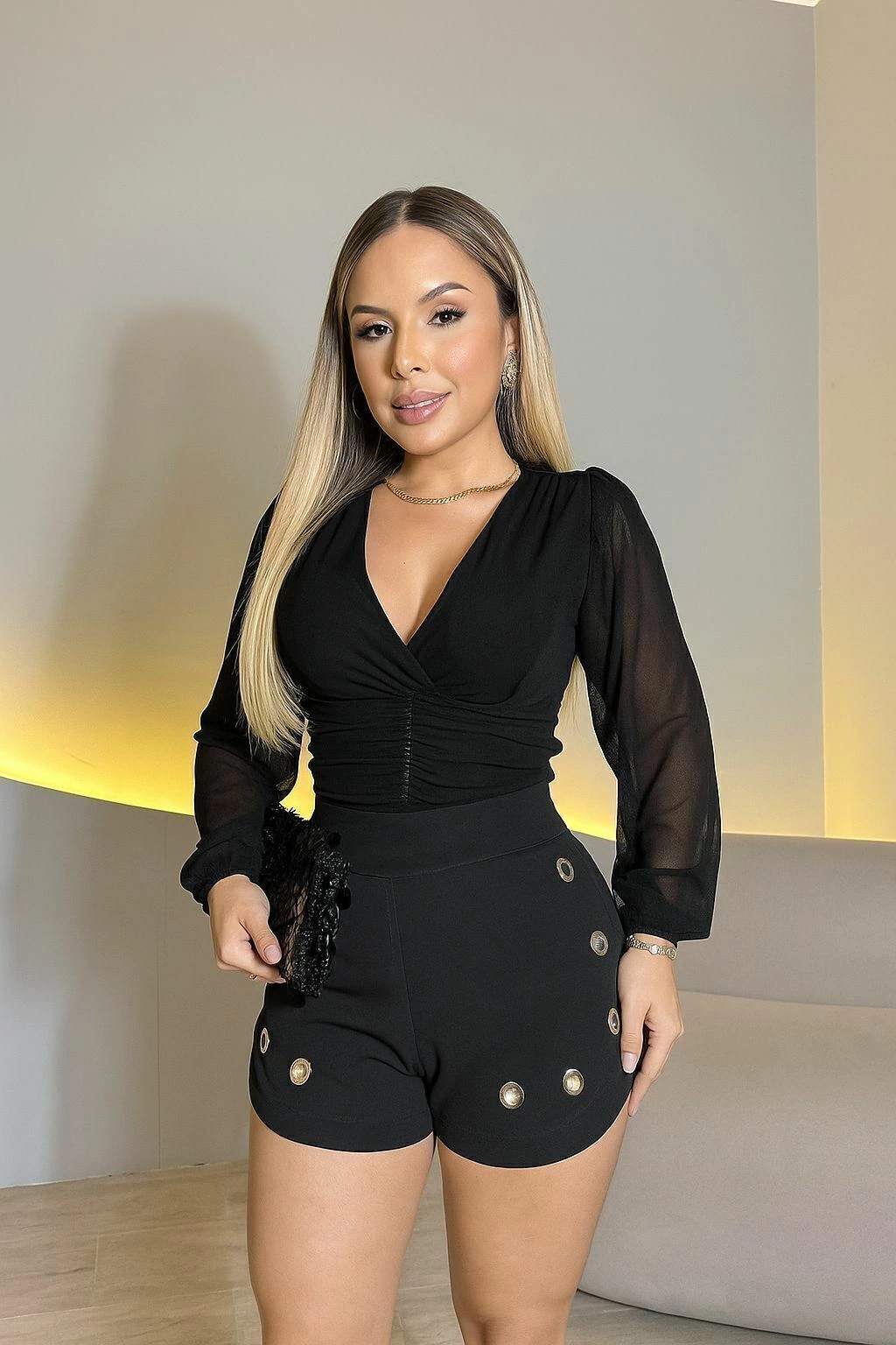 Modelo: Body com decote em V, drapeado na cintura e mangas longas e volumosas