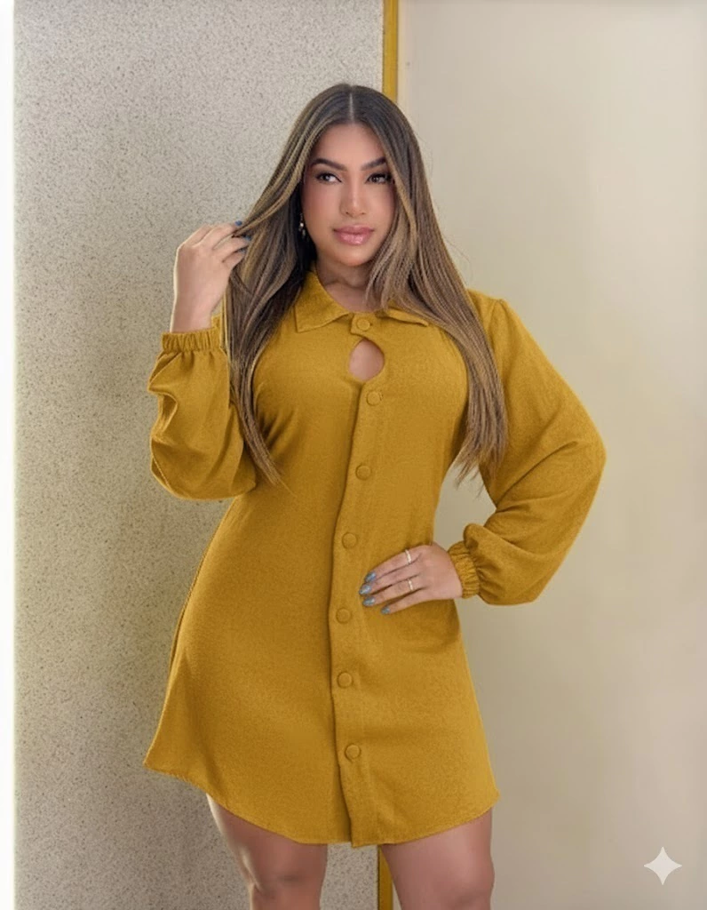 Vestido curto em tecido Crepe Duna, com modelagem moderna e versátil. Possui gola clássica, abertura com botões frontais e detalhe vazado sutil na gola, acrescentando charme à peça. As mangas longas com punho levemente franzido garantem elegância e conforto, tornando o vestido perfeito para diferentes ocasiões. Tamanho único, veste do 38 ao 42, com caimento leve e estruturado.