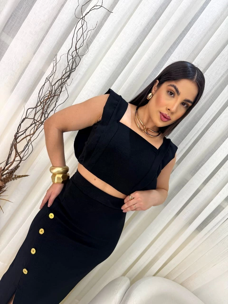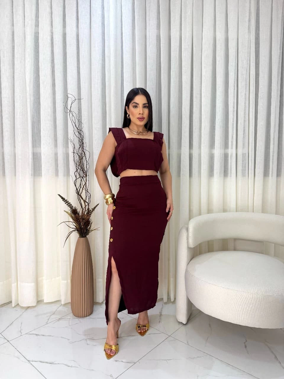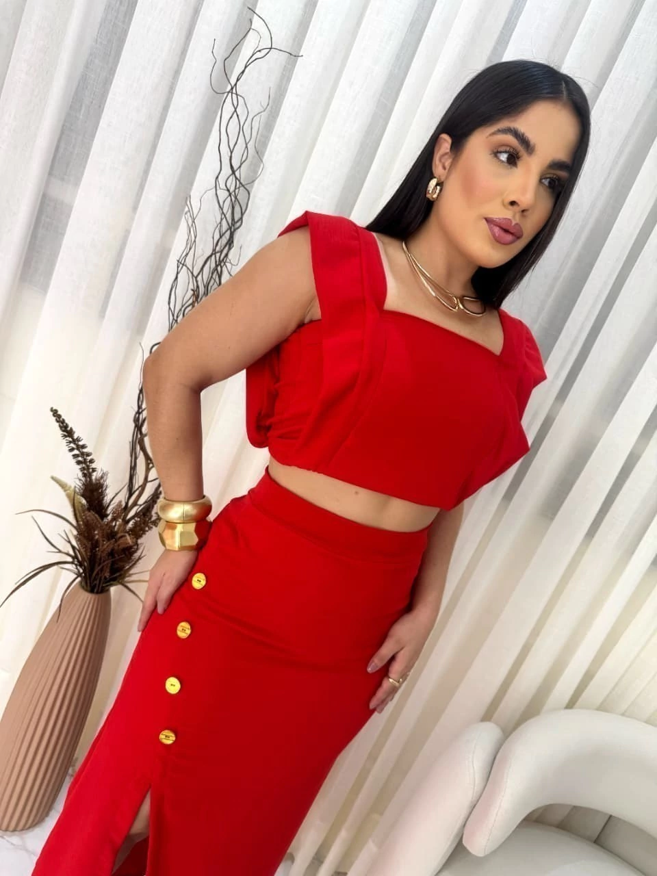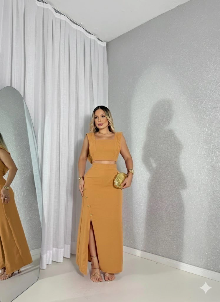 O top cropped com alças largas e decote reto valoriza o colo de forma sofisticada, enquanto a saia midi transpassada com fenda frontal e botões decorativos traz um toque moderno e delicado. Uma peça perfeita para compromissos casuais ou produções mais elaboradas.