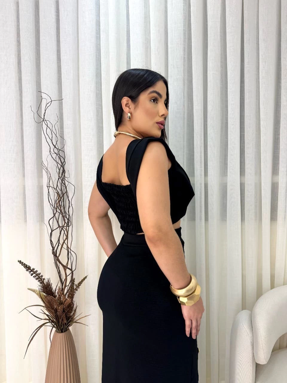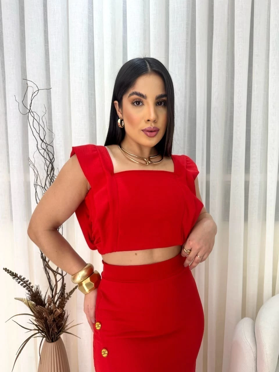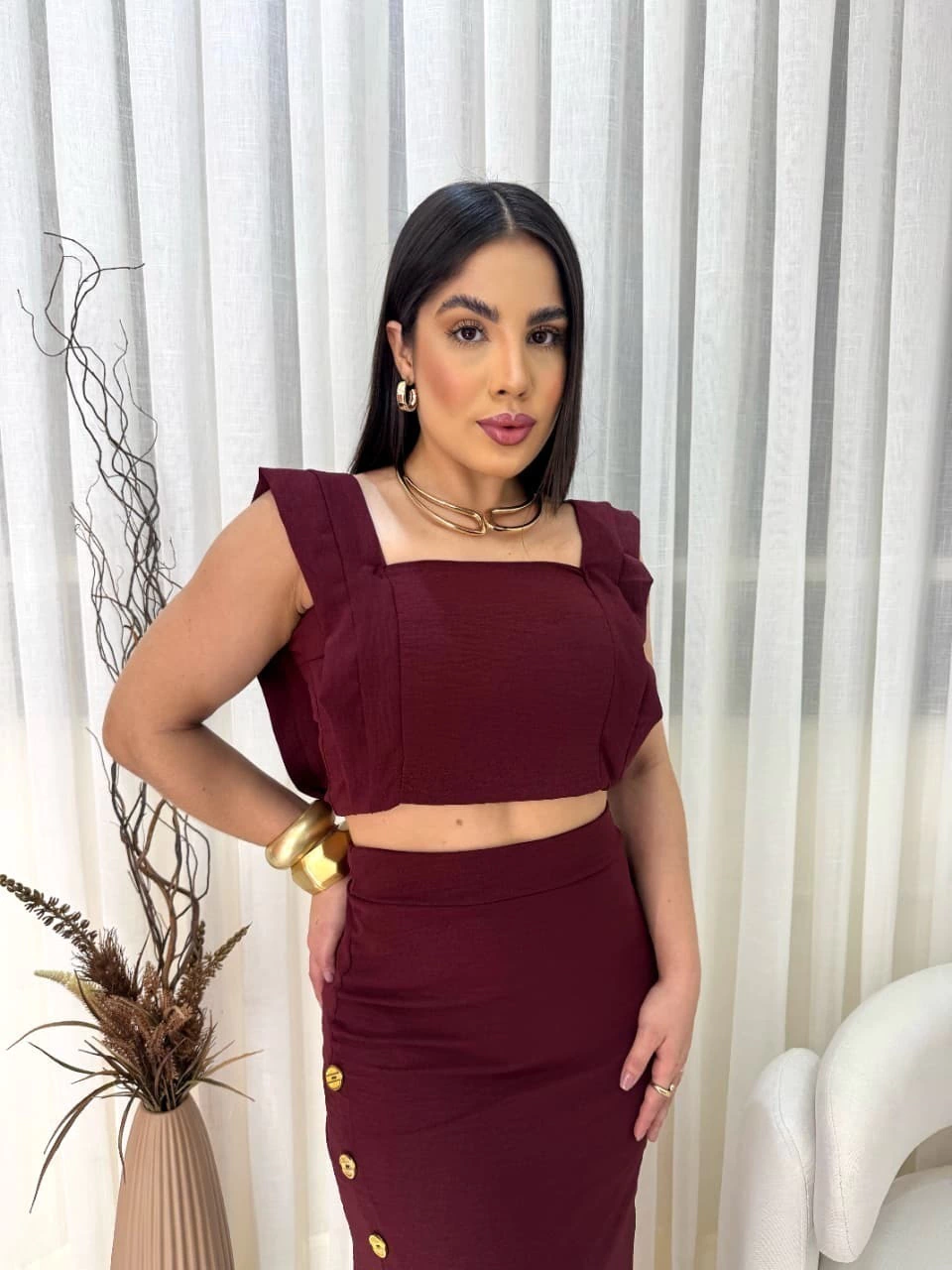 O top cropped com alças largas e decote reto valoriza o colo de forma sofisticada, enquanto a saia midi transpassada com fenda frontal e botões decorativos traz um toque moderno e delicado. Uma peça perfeita para compromissos casuais ou produções mais elaboradas.