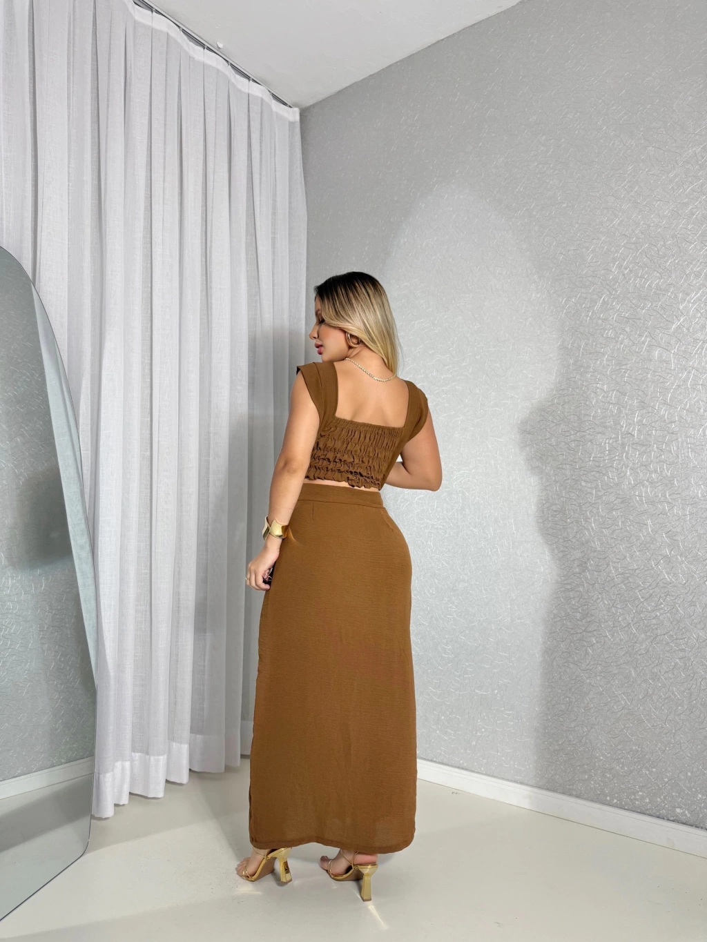 Conjunto composto por top cropped + saia midi