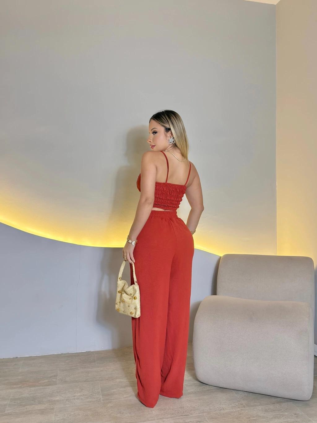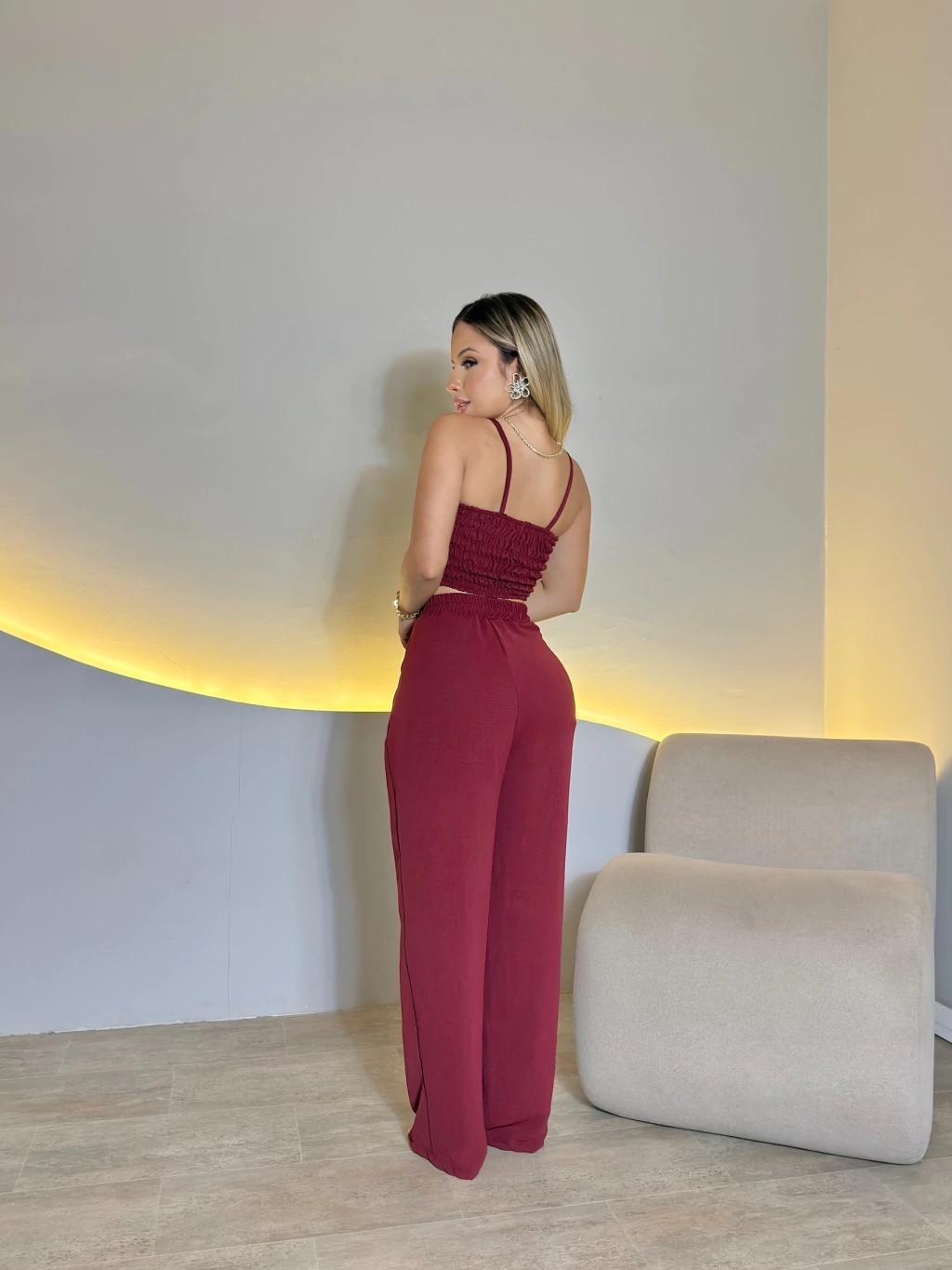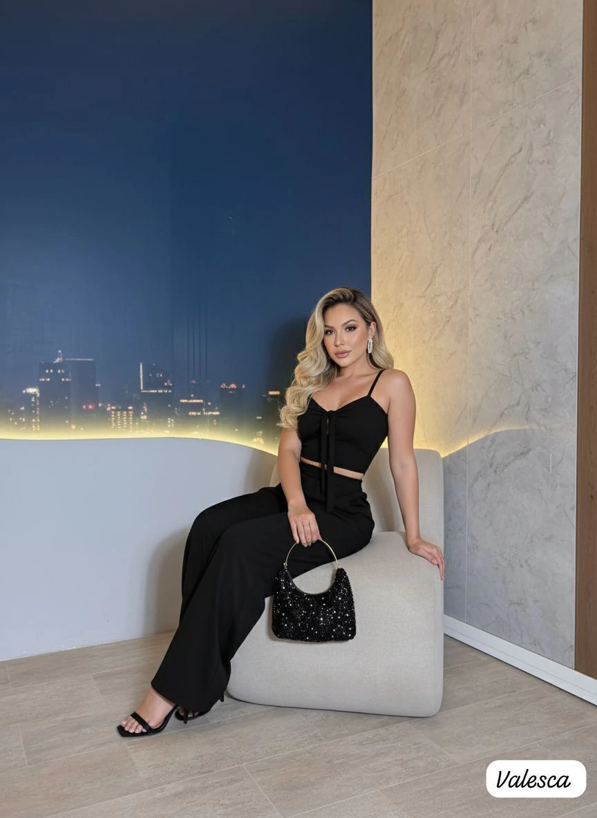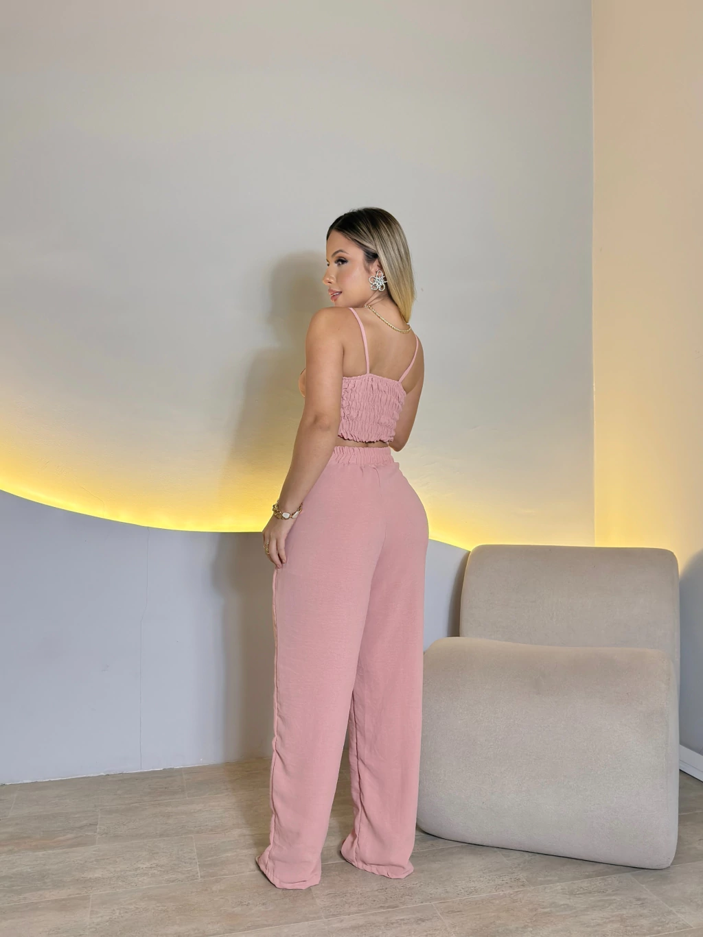 Conforto e elegância definem esse conjunto em Crepe Duna, perfeito para compor produções leves, modernas e estilosas. O modelo traz um cropped com alças finas e detalhe de amarração frontal, realçando o busto de forma delicada. Acompanha calça de cintura alta com caimento reto e soltinho, que proporciona leveza e liberdade nos movimentos. Um conjunto versátil, ideal para diversas ocasiões, do passeio casual ao look mais elaborado.