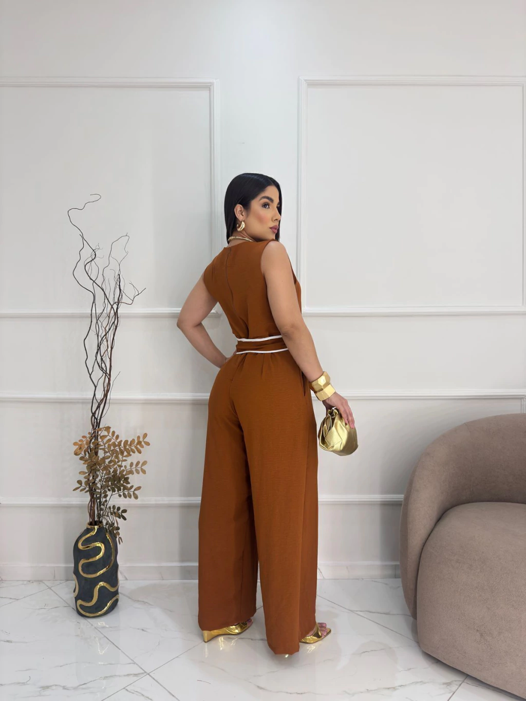 A cintura marcada com faixa para amarração valoriza a silhueta, enquanto a calça pantalona garante fluidez e movimento, ideal para diferentes tipos de corpo. Versátil, pode ser usado tanto em eventos casuais quanto em produções mais elaboradas.