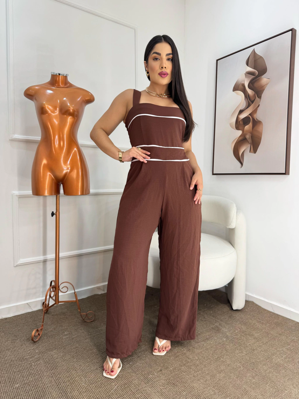 Conforto e estilo em uma única peça. Este macacão confeccionado em crepe Duna é forrado, proporcionando um toque suave à pele e caimento impecável. O modelo conta com alças largas e decote reto com recorte sutil no busto, valorizando a silhueta com elegância.