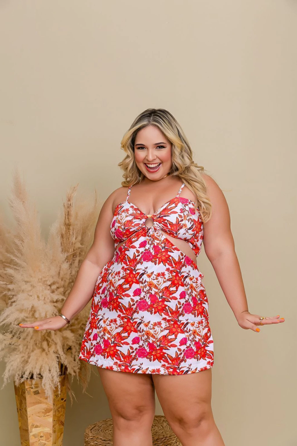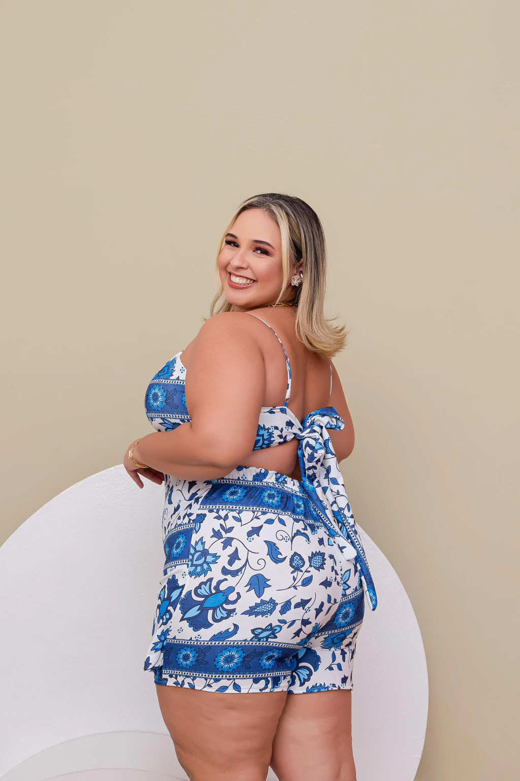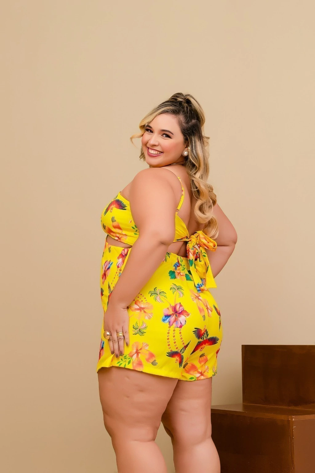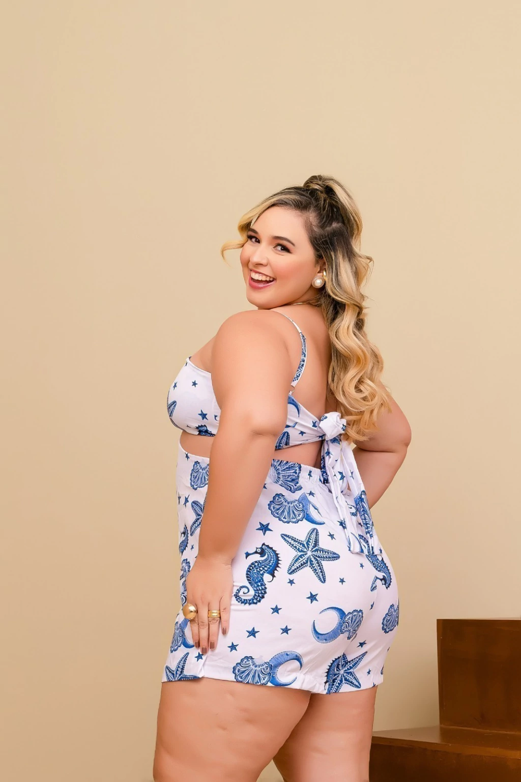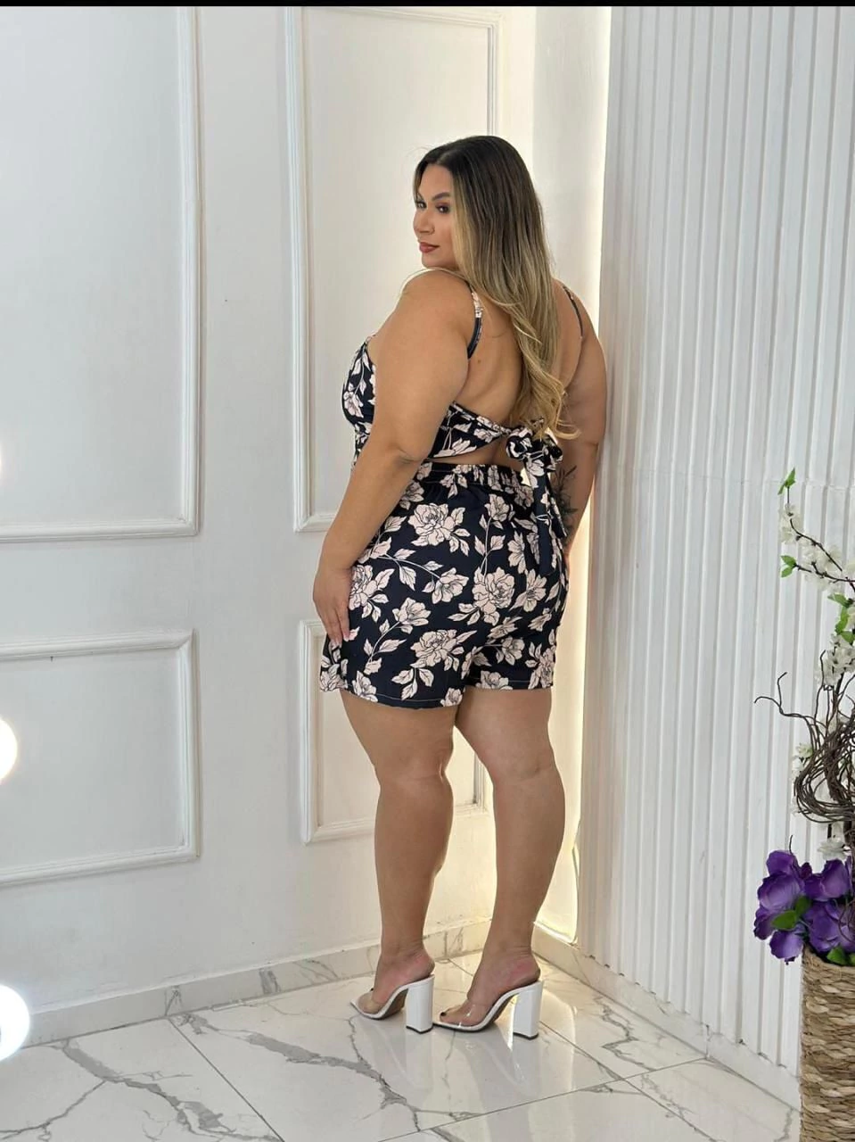 Este macaquinho plus size é a escolha perfeita para quem busca conforto, estilo e versatilidade. Com modelagem que valoriza o corpo, possui amarração nas costas e recorte frontal, conferindo um toque moderno e sensual. Ideal para dias quentes, viagens ou passeios descontraídos.