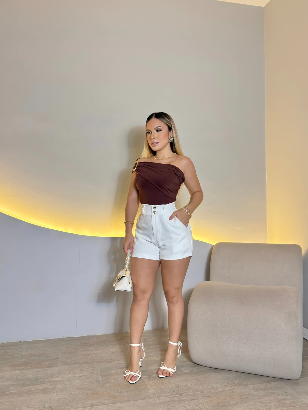 Esse short é a combinação ideal de elegância e praticidade. Seu corte reto e estruturado proporciona um caimento sofisticado, perfeito para ocasiões casuais ou produções mais refinadas. A cintura alta valoriza a silhueta e garante um visual moderno e alinhado. O fechamento frontal com dois botões dourados traz um toque de charme e sofisticação, enquanto os passantes largos permitem compor o look com cintos mais grossos, agregando ainda mais estilo. É uma peça curinga para qualquer guarda-roupa feminino.