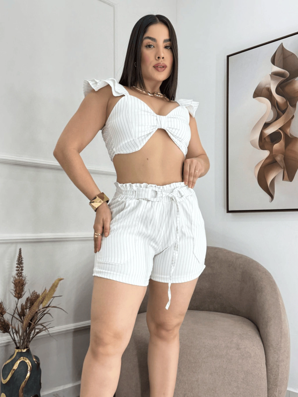 Short feminino moderno e elegante, confeccionado em tecido de alfaiataria com estampa risca de giz, ideal para compor looks sofisticados e versáteis. O modelo possui cós alto com elástico e detalhe de babado na cintura, conferindo um charme extra à peça.