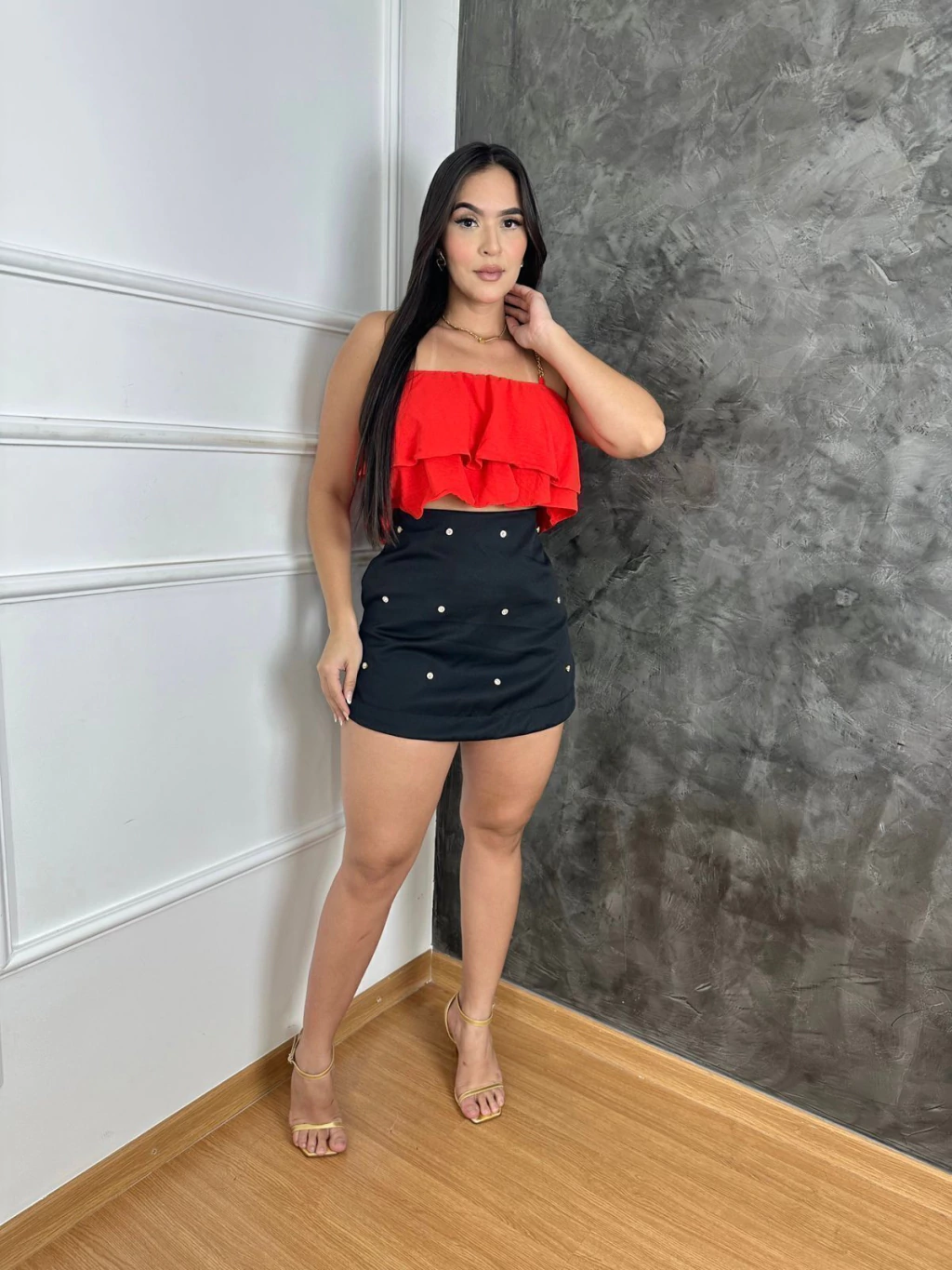 As aplicações de Strass pontos de luz adicionam um toque sutil de brilho, elevando o visual. Uma peça única para a mulher moderna que exige estilo e conforto em todas as ocasiões.