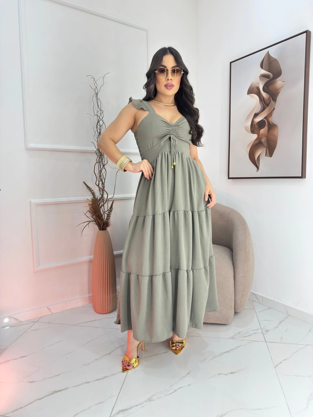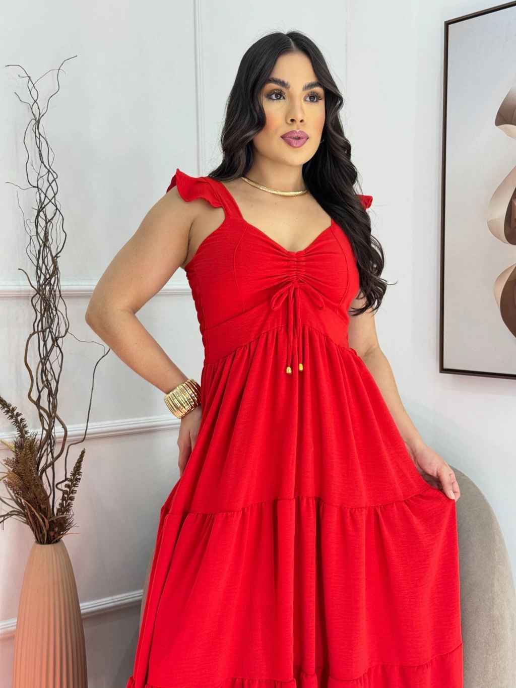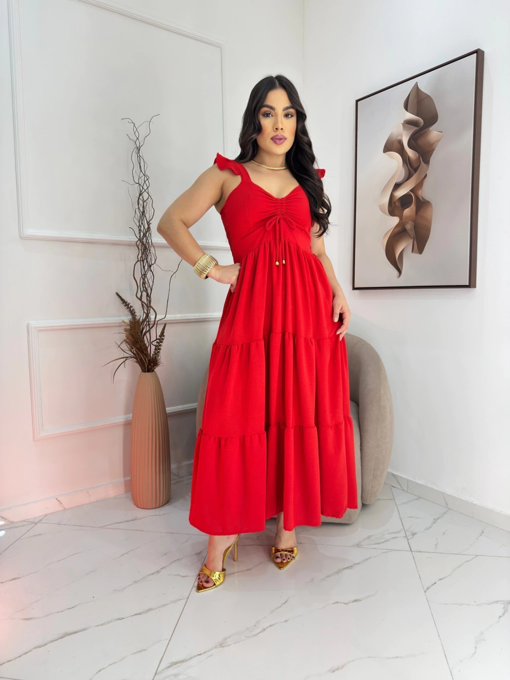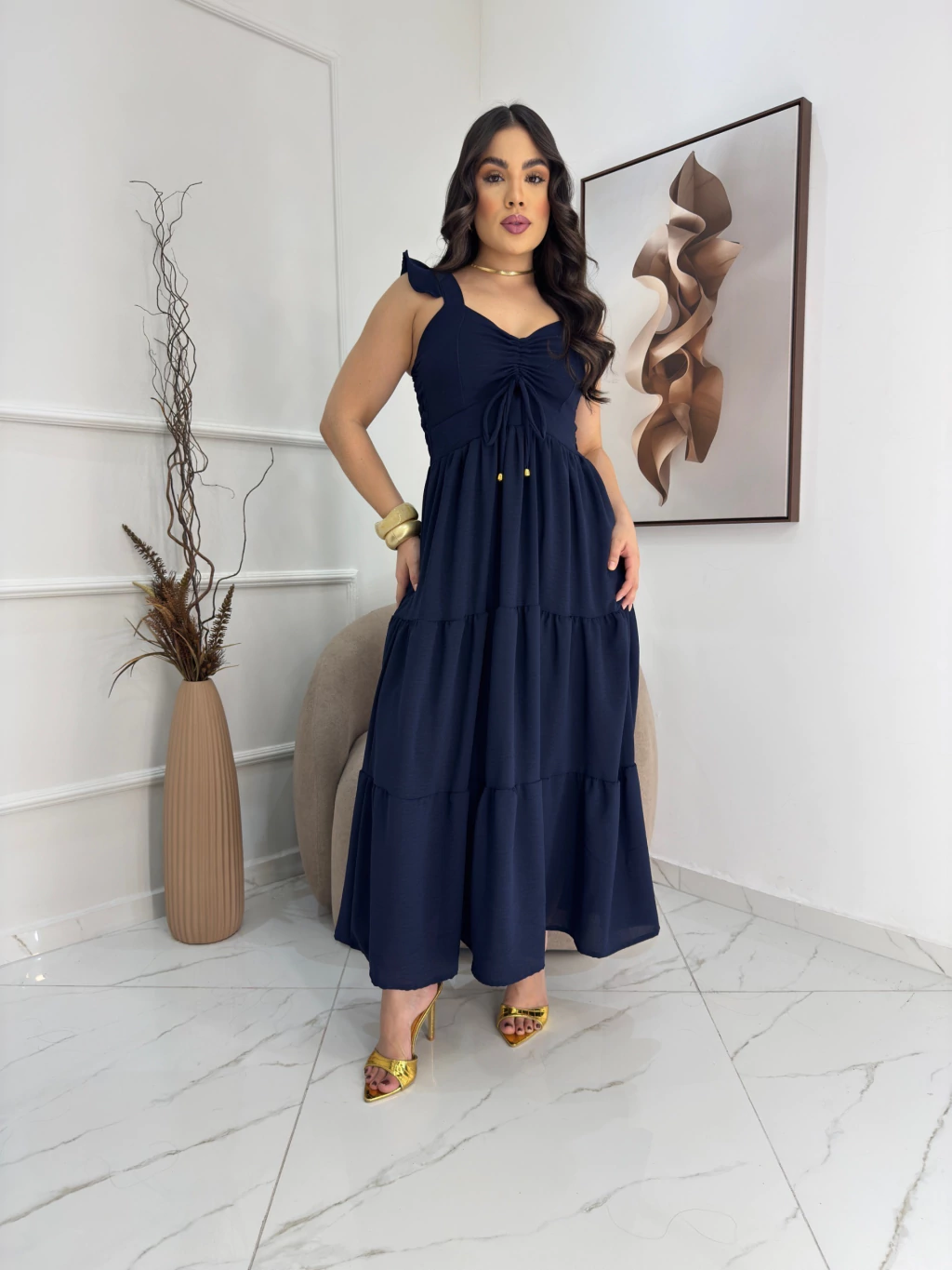 Este vestido midi combina elegância e conforto em um design moderno e versátil. Confeccionado em Crepe Duna, possui caimento leve e forro interno, garantindo um toque agradável e seguro ao vestir. O modelo apresenta decote em “V” com franzido ajustável, realçando o busto de forma delicada, e alças com babados sutis, que trazem feminilidade ao look. A saia com recortes em camadas proporciona movimento fluido e sofisticado, ideal para diferentes ocasiões.