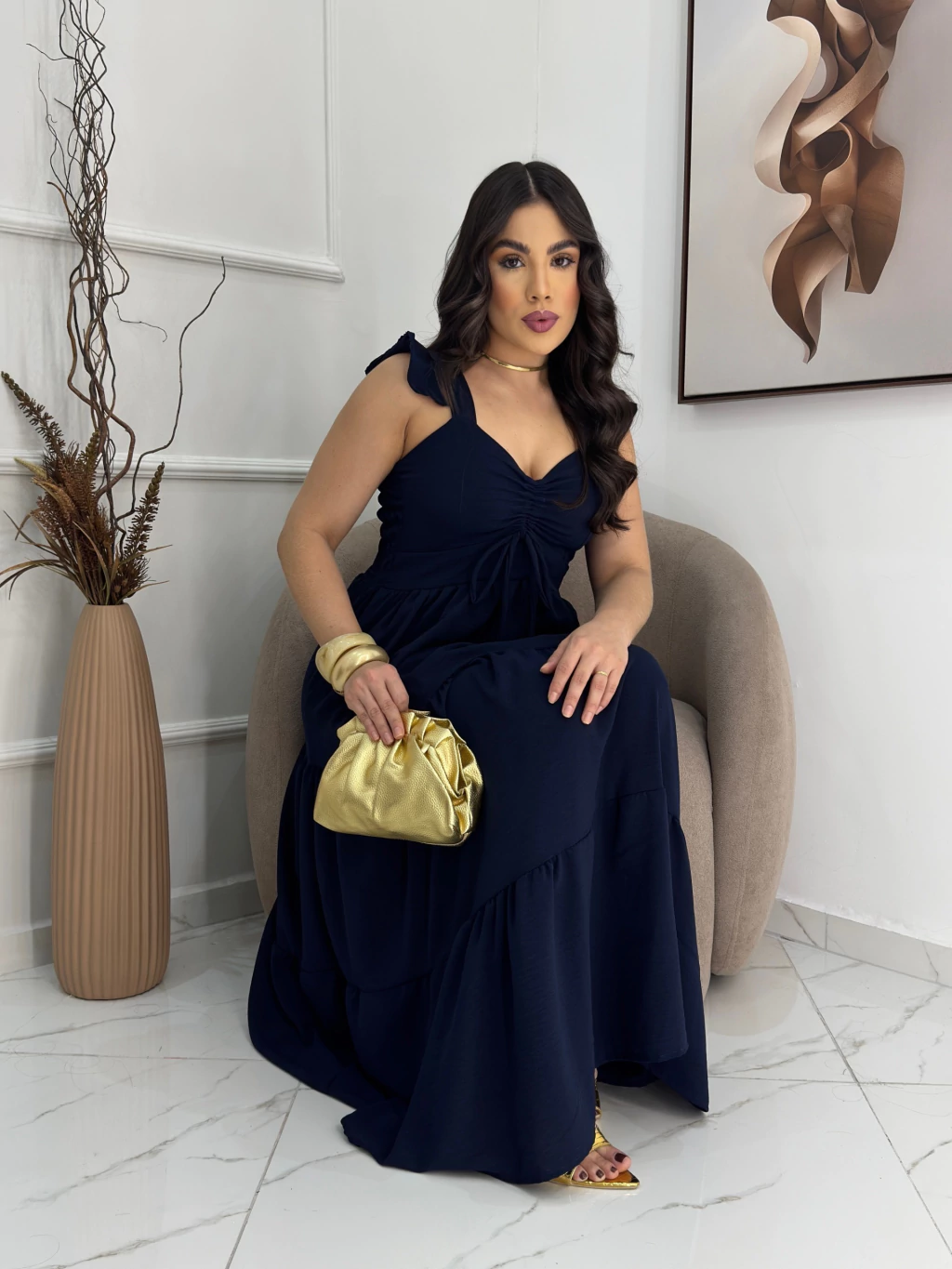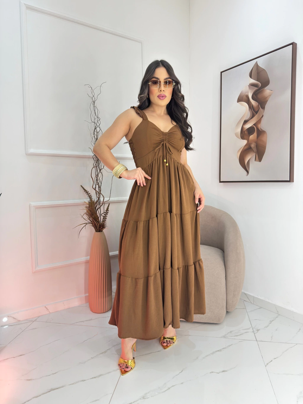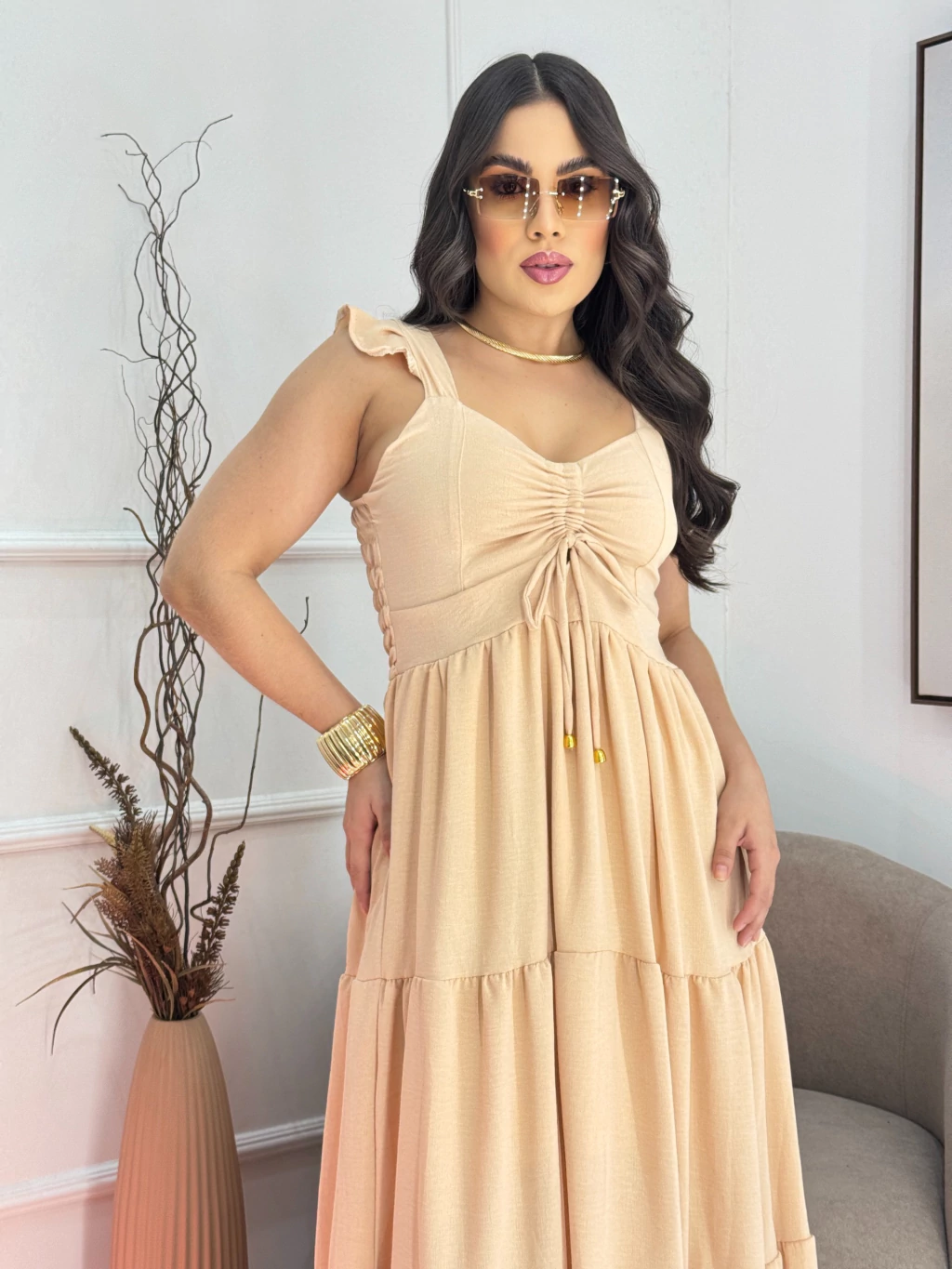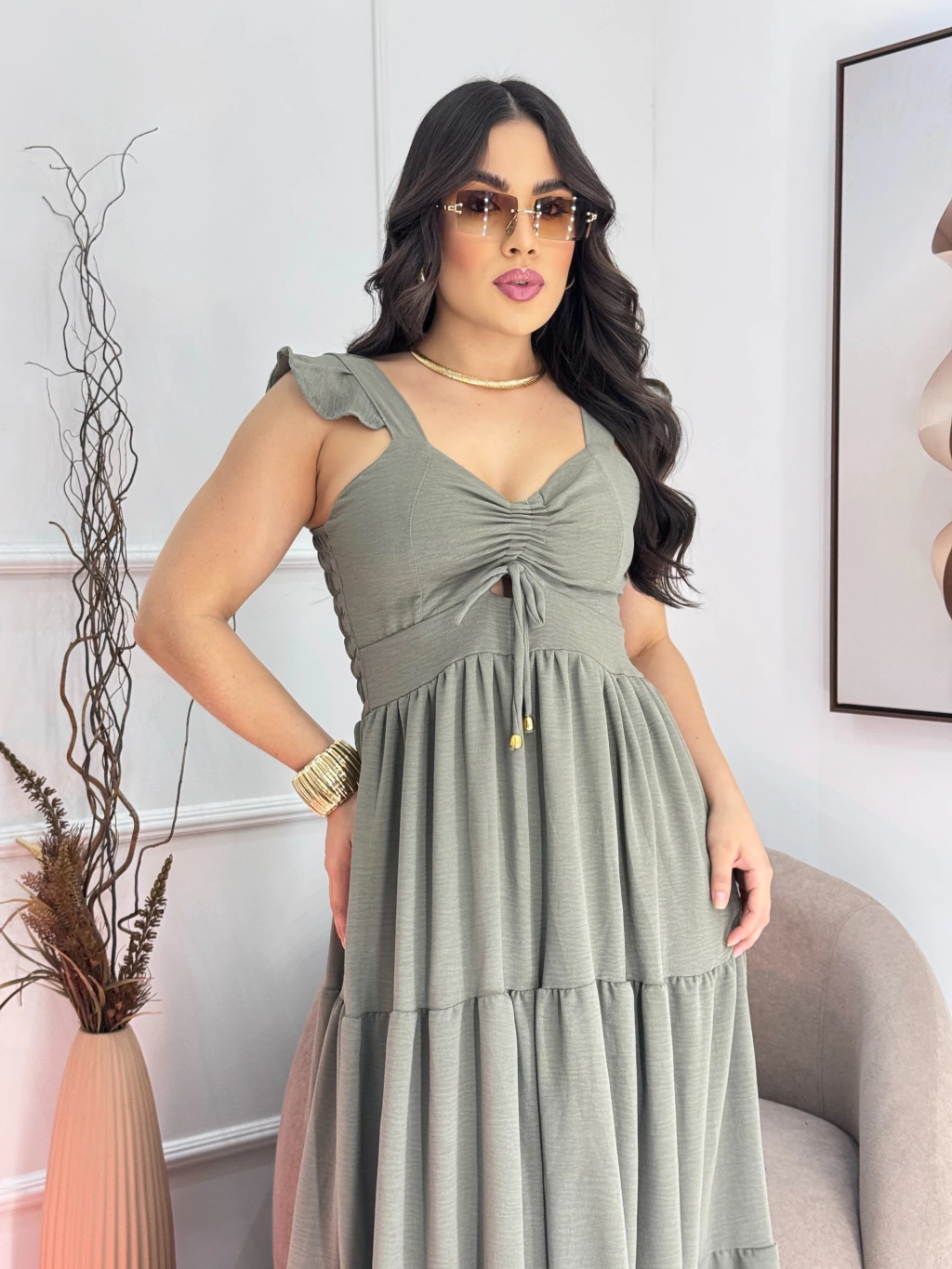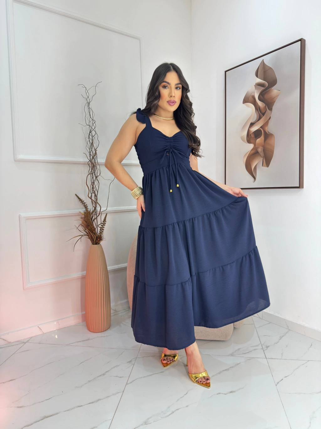 Este vestido midi combina elegância e conforto em um design moderno e versátil. Confeccionado em Crepe Duna, possui caimento leve e forro interno, garantindo um toque agradável e seguro ao vestir. O modelo apresenta decote em “V” com franzido ajustável, realçando o busto de forma delicada, e alças com babados sutis, que trazem feminilidade ao look. A saia com recortes em camadas proporciona movimento fluido e sofisticado, ideal para diferentes ocasiões.