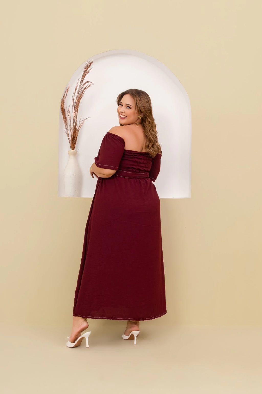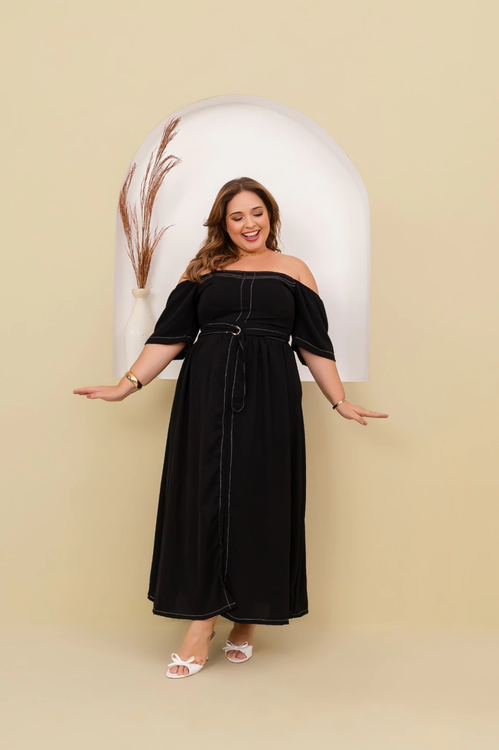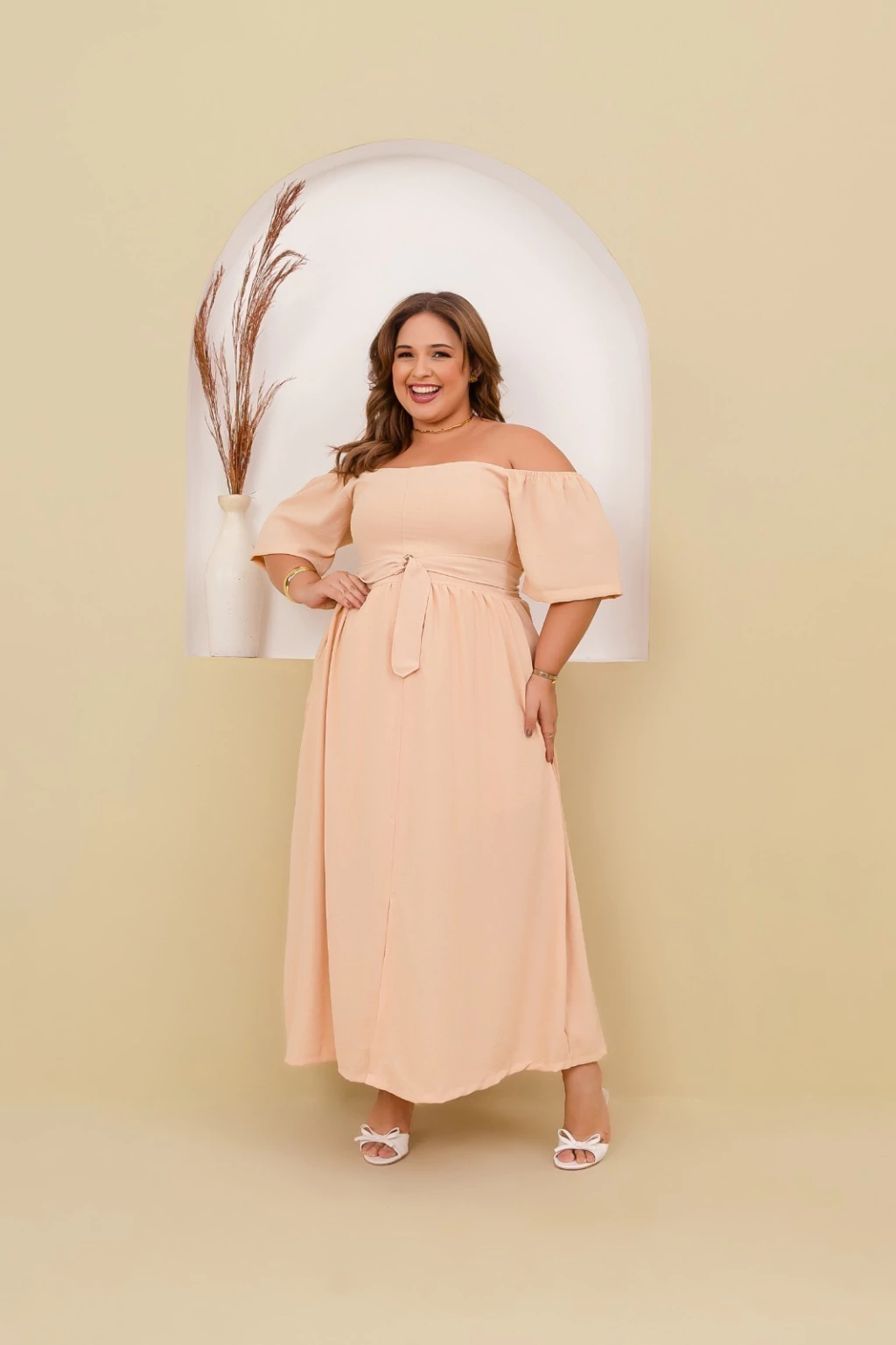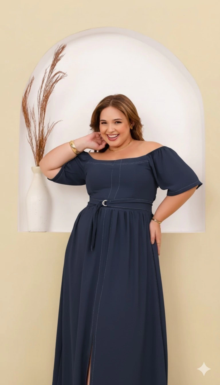 Vestido longo confeccionado em tecido Crepe Duna, ideal para quem busca elegância e conforto em uma única peça. O modelo apresenta decote ombro a ombro, que valoriza o colo, e mangas curtas amplas, oferecendo um caimento leve e sofisticado. Possui faixa do mesmo tecido para amarração na cintura, criando um ajuste perfeito e valorizando a silhueta. A saia longa com caimento fluido garante movimento e charme em cada passo, tornando-o perfeito para ocasiões especiais ou momentos casuais com um toque refinado.