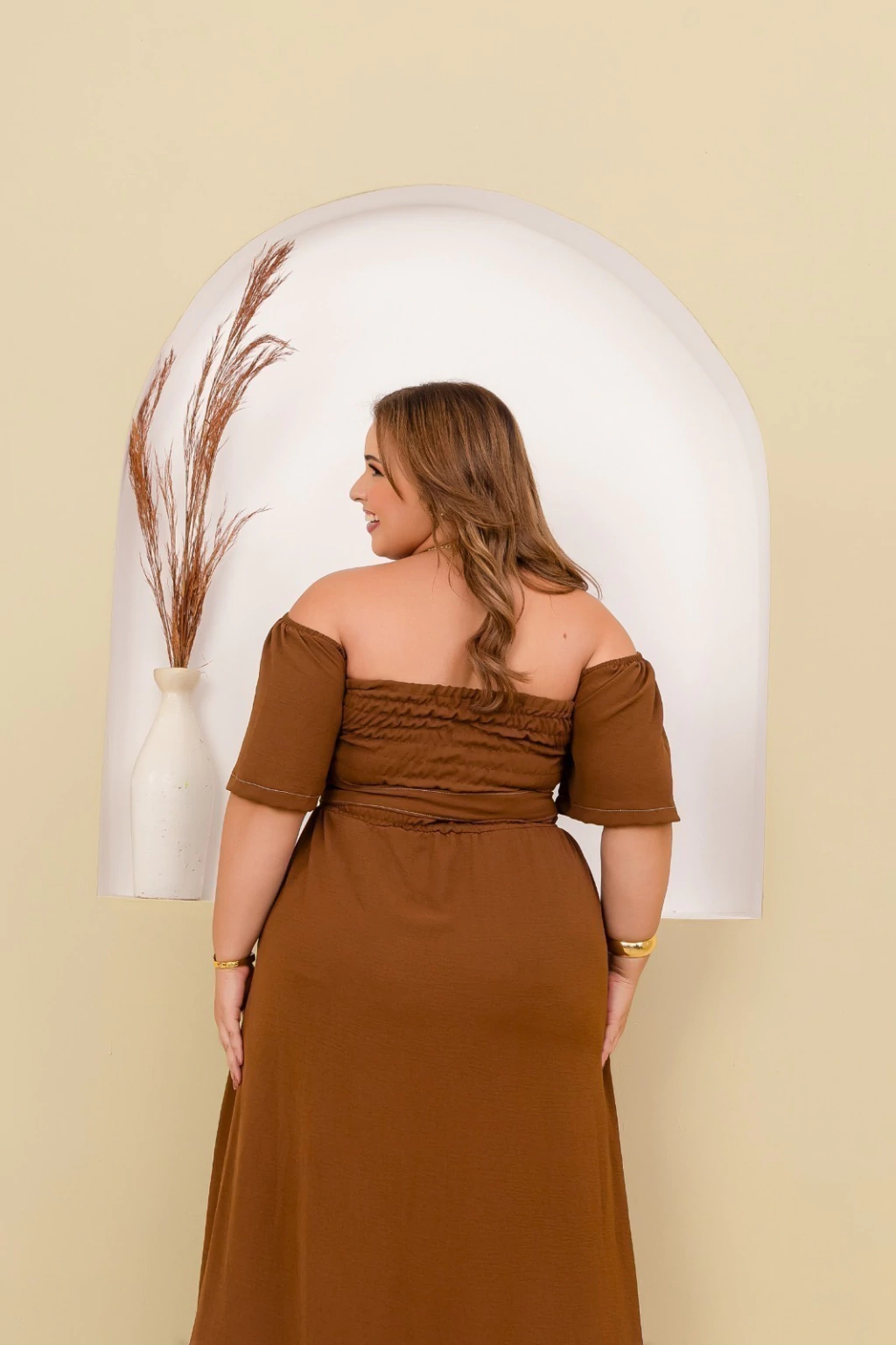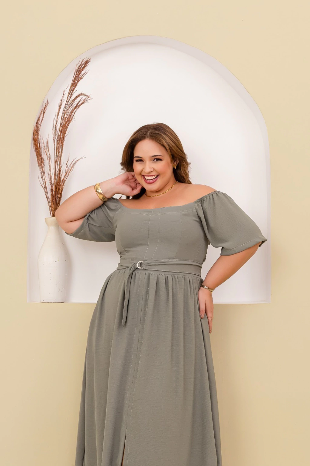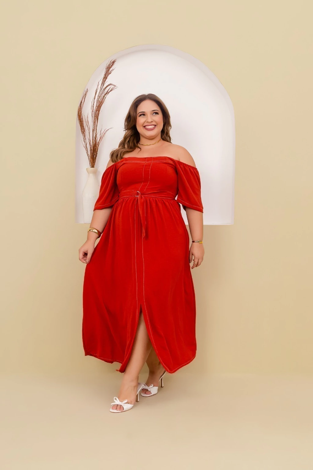 Vestido longo confeccionado em tecido Crepe Duna, ideal para quem busca elegância e conforto em uma única peça. O modelo apresenta decote ombro a ombro, que valoriza o colo, e mangas curtas amplas, oferecendo um caimento leve e sofisticado. Possui faixa do mesmo tecido para amarração na cintura, criando um ajuste perfeito e valorizando a silhueta. A saia longa com caimento fluido garante movimento e charme em cada passo, tornando-o perfeito para ocasiões especiais ou momentos casuais com um toque refinado.