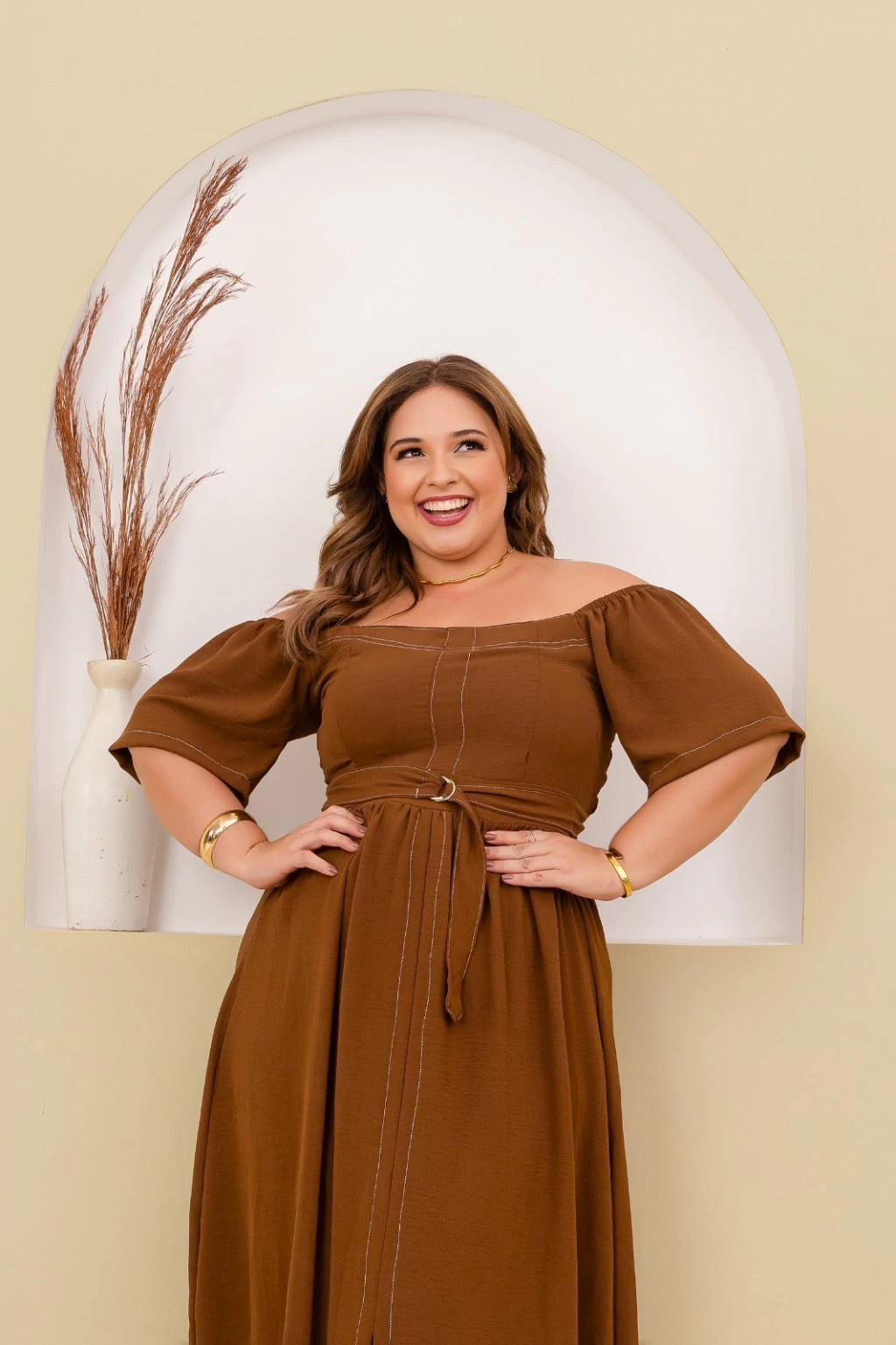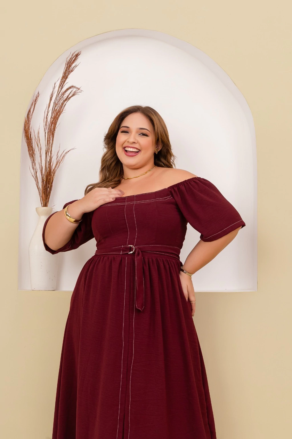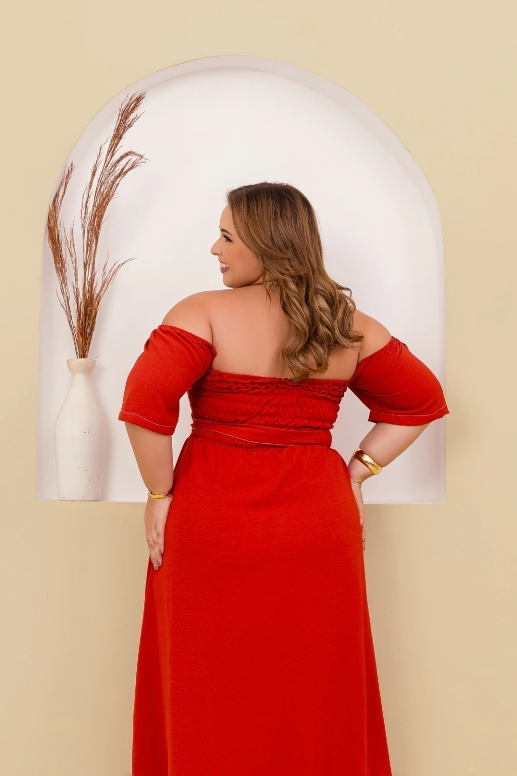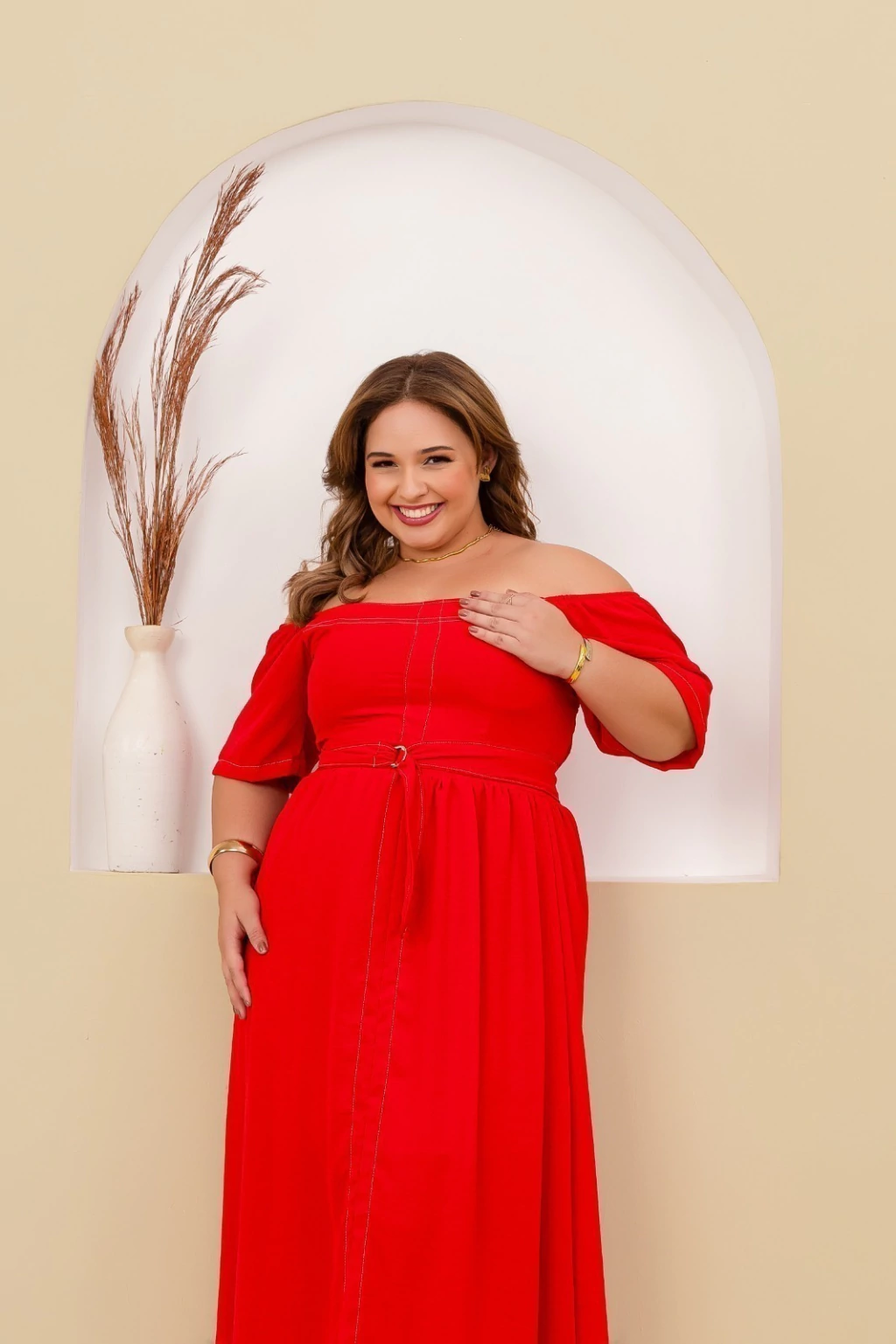 Vestido longo confeccionado em tecido Crepe Duna, ideal para quem busca elegância e conforto em uma única peça. O modelo apresenta decote ombro a ombro, que valoriza o colo, e mangas curtas amplas, oferecendo um caimento leve e sofisticado. Possui faixa do mesmo tecido para amarração na cintura, criando um ajuste perfeito e valorizando a silhueta. A saia longa com caimento fluido garante movimento e charme em cada passo, tornando-o perfeito para ocasiões especiais ou momentos casuais com um toque refinado.