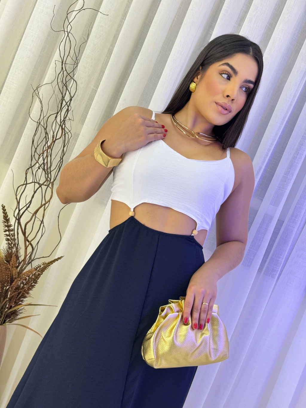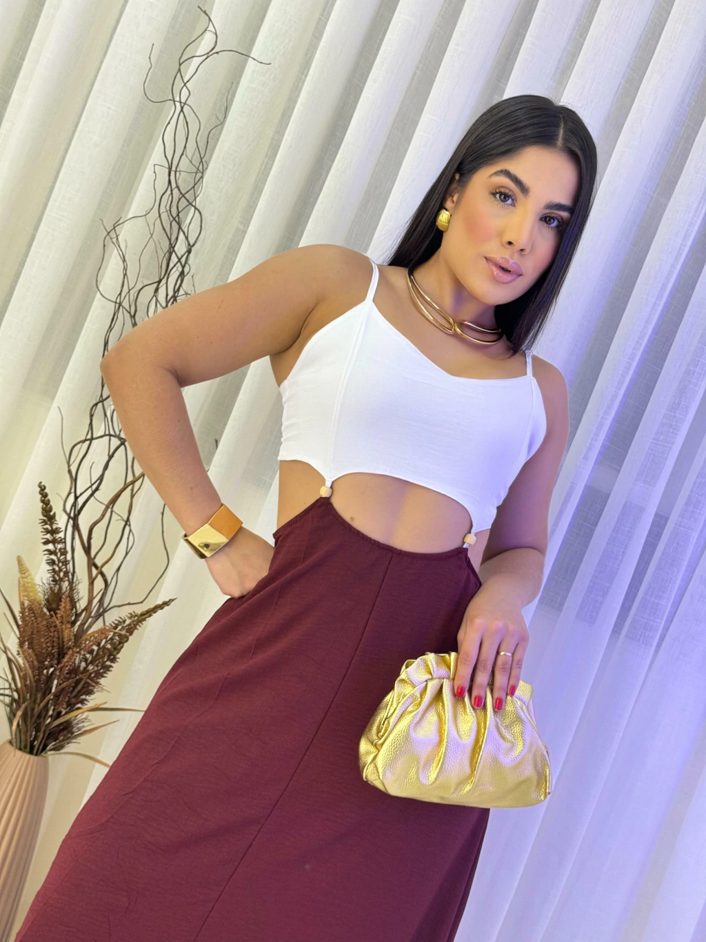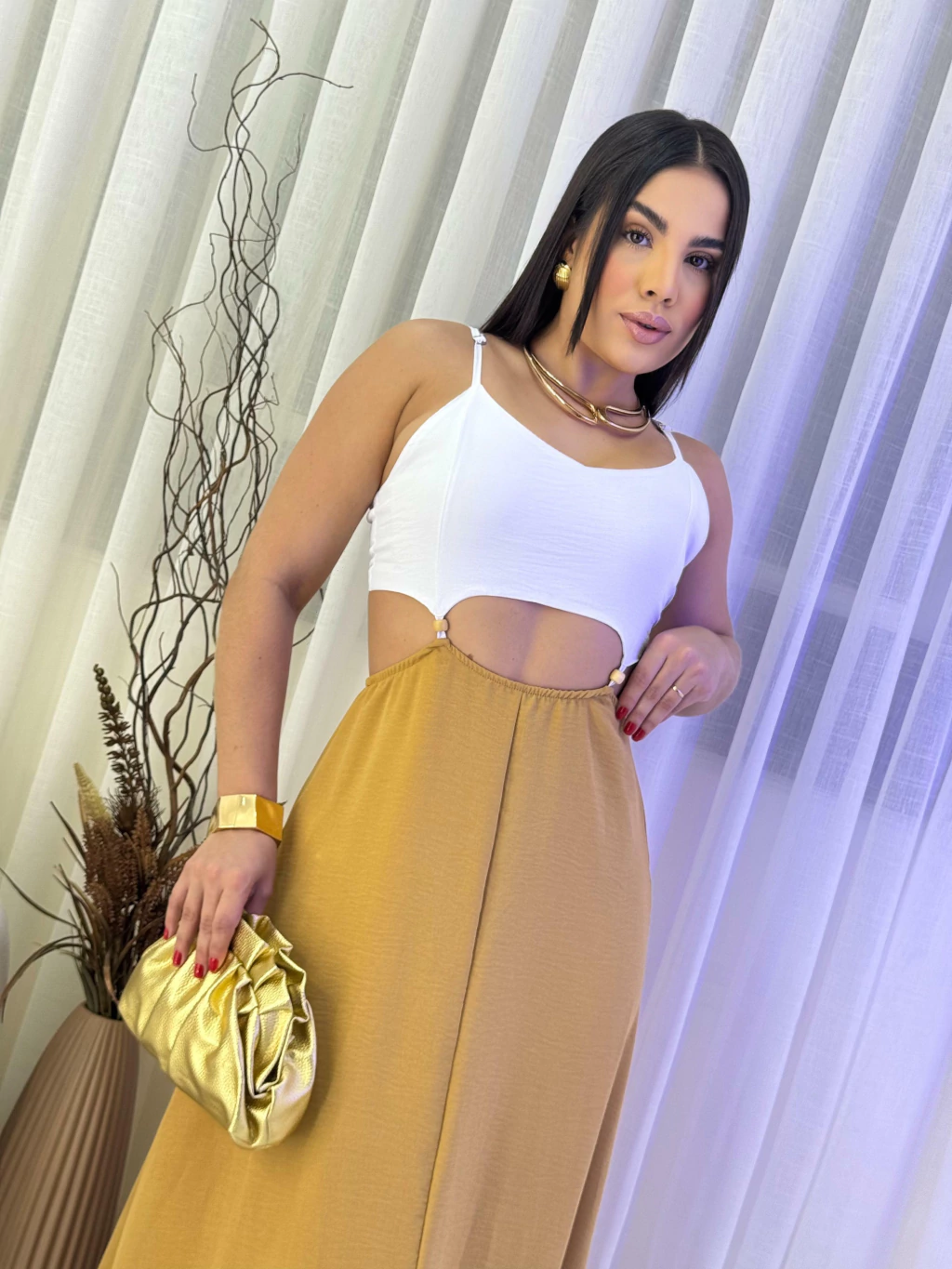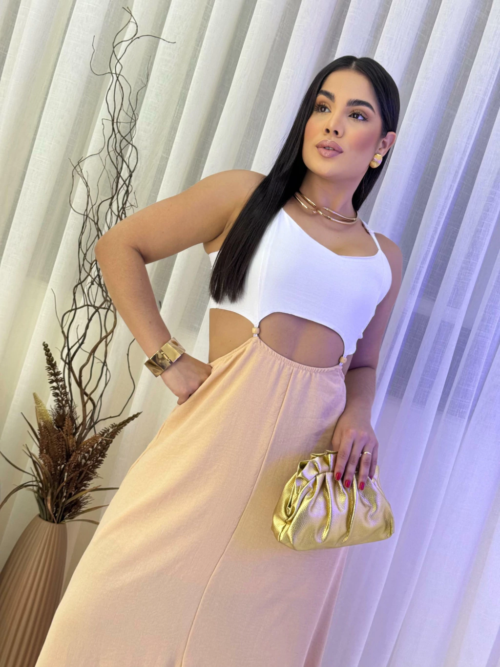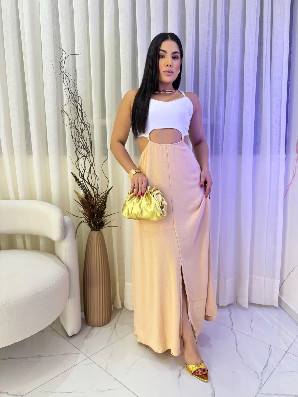 Com um design sofisticado e marcante, este vestido bicolor é a escolha perfeita para quem busca elegância com um toque de ousadia. A parte superior apresenta decote em V com recorte central abaixo do busto, conectando-se à saia por delicadas alças laterais que valorizam a silhueta de forma sutil e moderna. A saia ampla com caimento fluido garante movimento e conforto, ideal para eventos noturnos, jantares e ocasiões especiais.