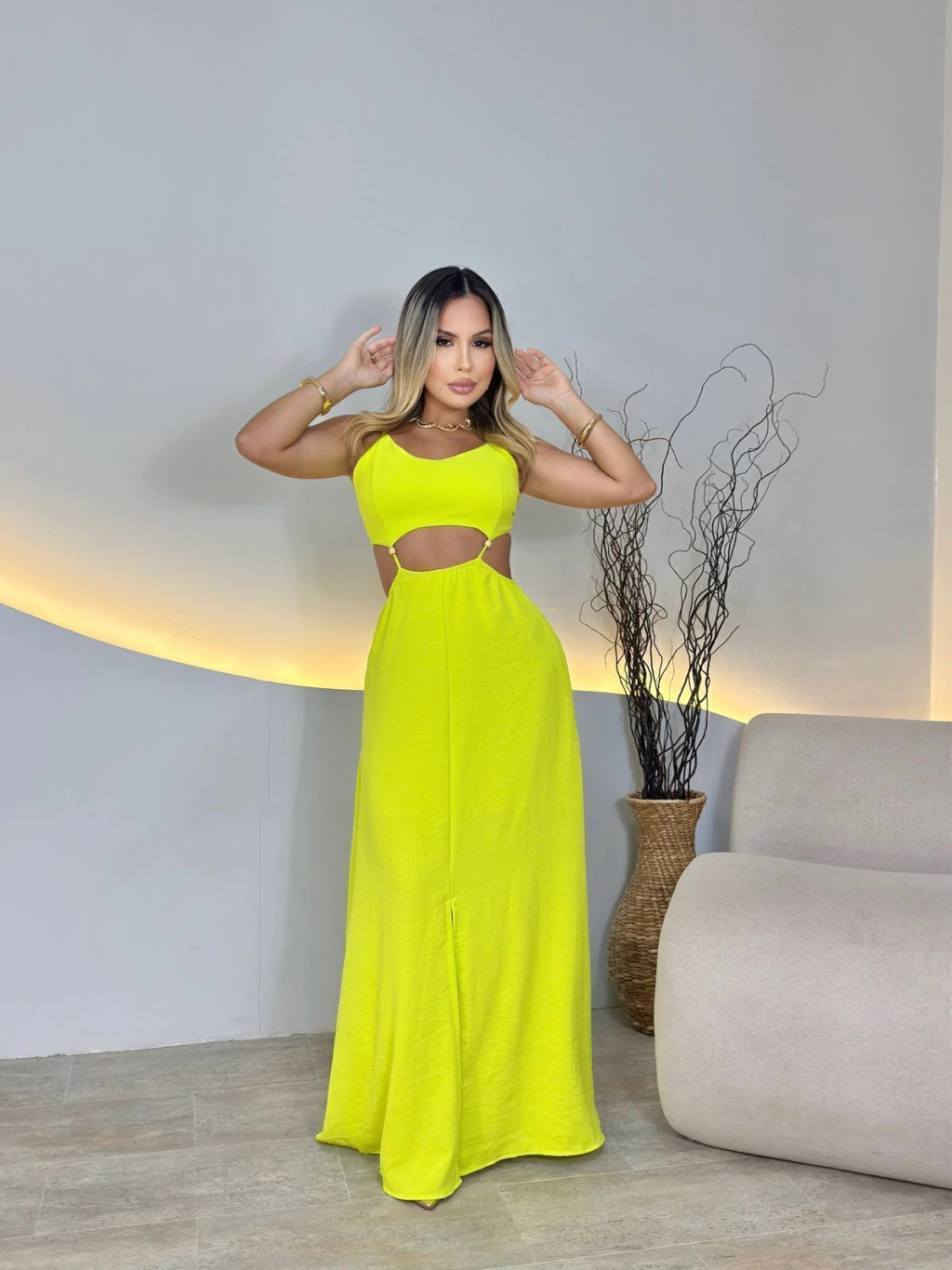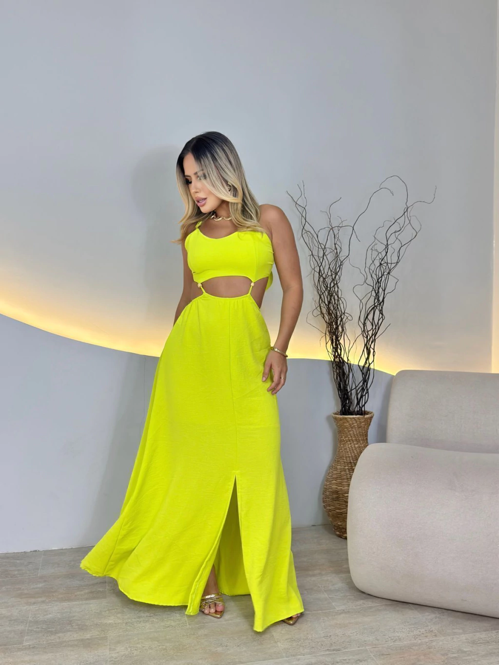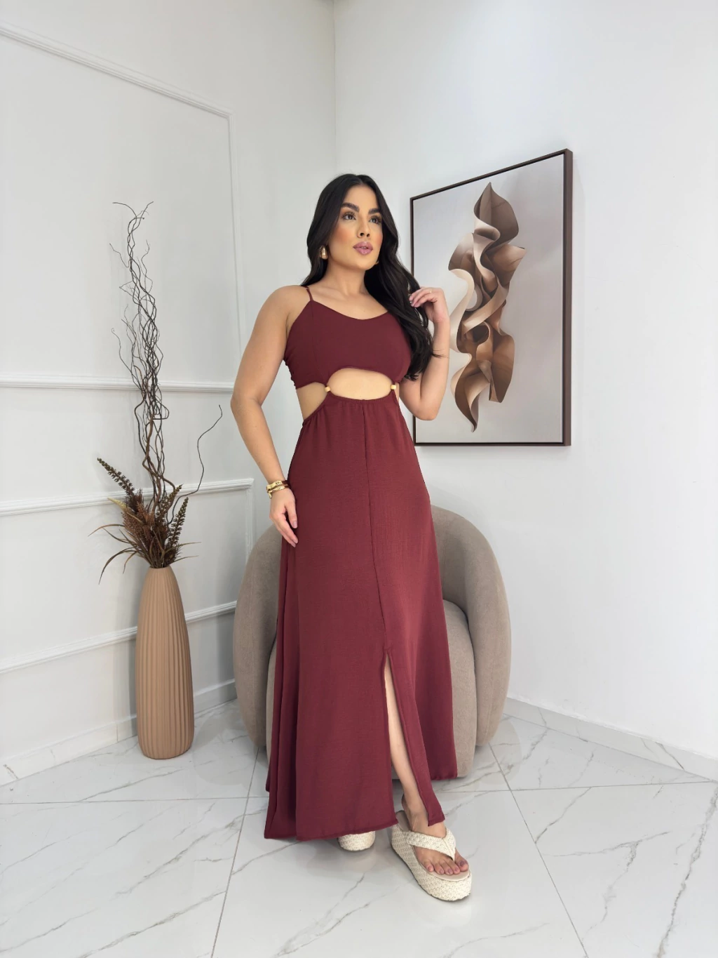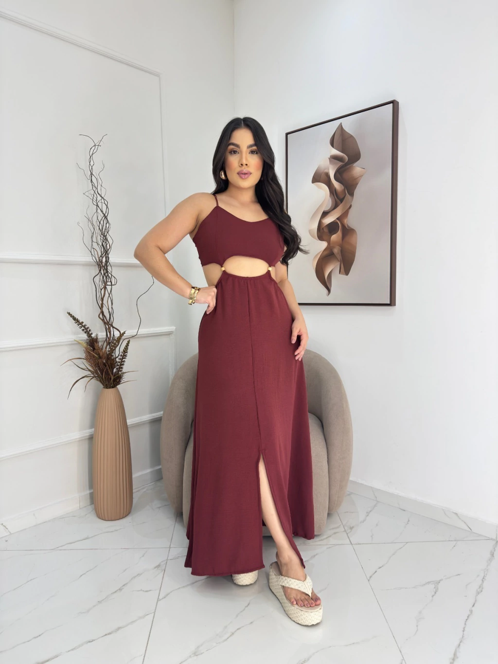 Vestido longo confeccionado em tecido Crepe Duna, com modelagem elegante e moderna. Possui alças finas, recorte frontal com detalhe em argolas e fenda discreta na parte frontal da saia, proporcionando um toque sofisticado e ao mesmo tempo sensual. A peça é totalmente forrada, garantindo conforto e um caimento impecável. Tamanho único, veste do 38 ao 42.