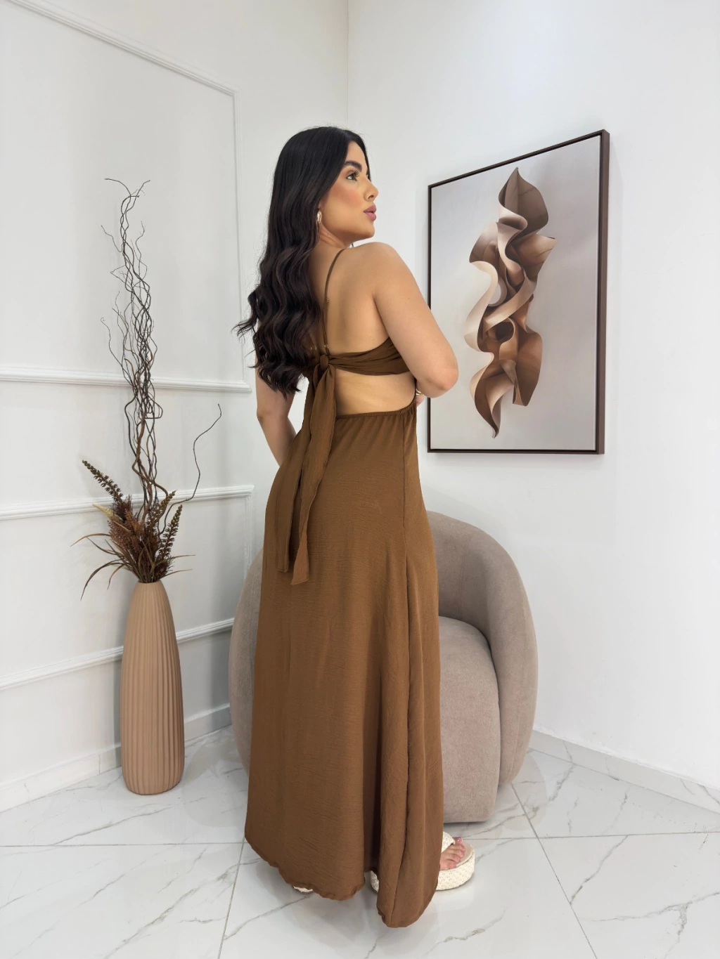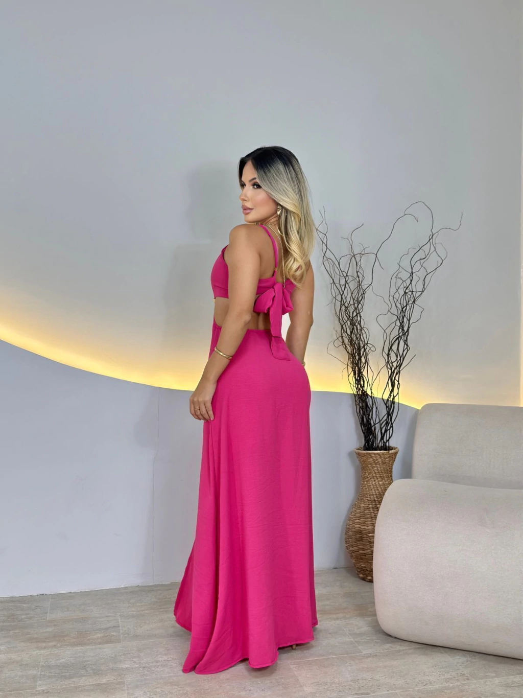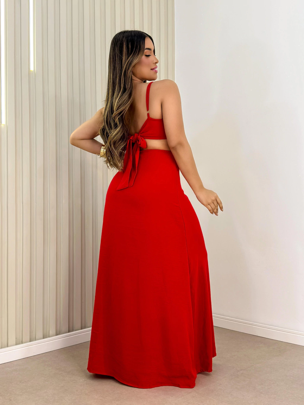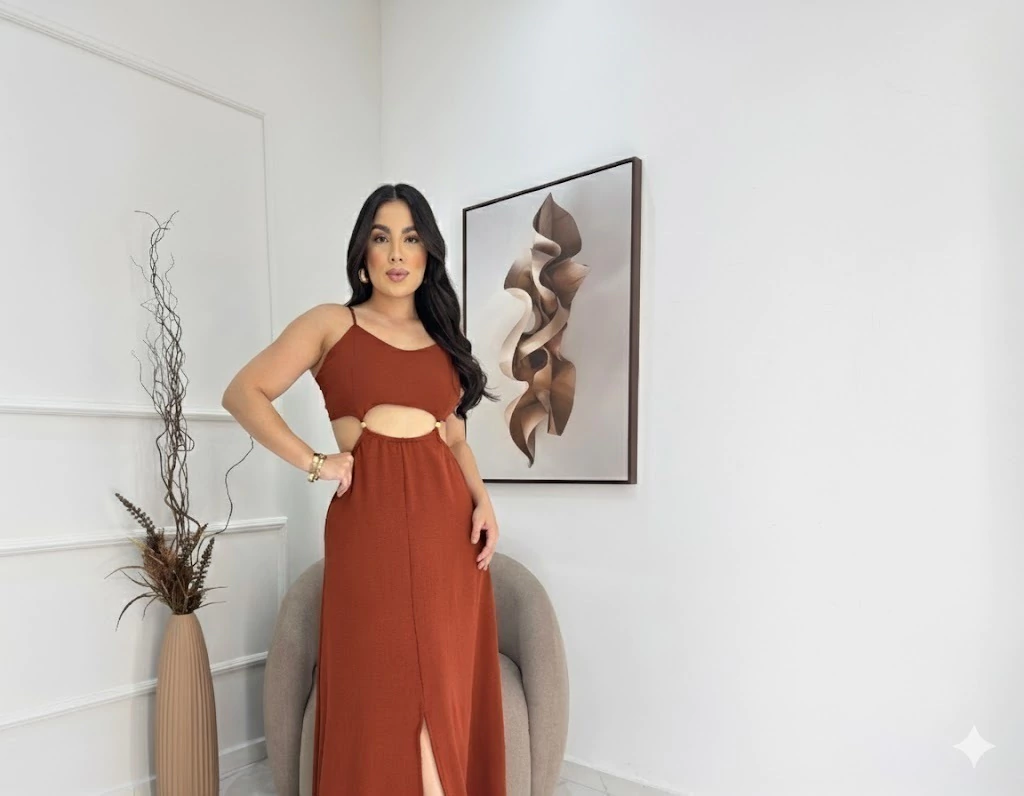 Vestido longo confeccionado em tecido Crepe Duna, com modelagem elegante e moderna. Possui alças finas, recorte frontal com detalhe em argolas e fenda discreta na parte frontal da saia, proporcionando um toque sofisticado e ao mesmo tempo sensual. A peça é totalmente forrada, garantindo conforto e um caimento impecável. Tamanho único, veste do 38 ao 42.